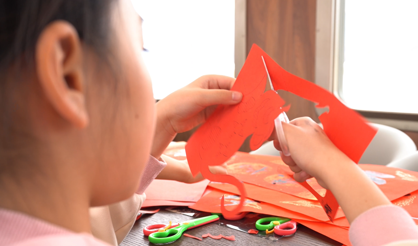 在會議車廂,司乘人員為乘客準(zhǔn)備了筆墨紙硯,大家紛紛拿起毛筆,揮毫潑墨。一副副春聯(lián)和福字在大家的筆下誕生,有的蒼勁有力,有的清新秀麗,為蛇年春節(jié)增添了文化氛圍。心靈手巧的游客還拿起剪刀,將一張張紅紙剪成各種各樣的圖案,這些精美的剪紙作品不僅是藝術(shù)品,更是游客對新年的美好祝福。