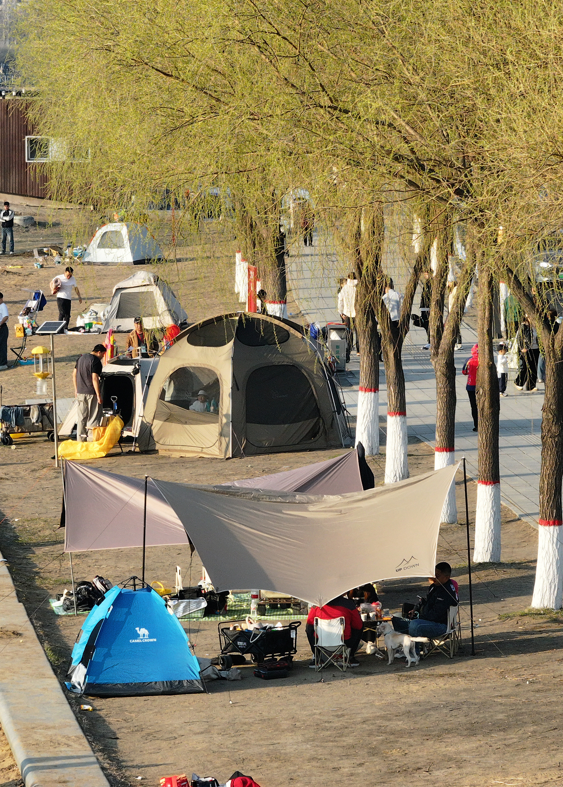 近日,哈爾濱市春光明媚,哈爾濱大劇院濕地有大批市民在此露營,享受春光。沙灘上,樹蔭下,孩子們盡情嬉戲玩耍,大人們?cè)谝慌砸安痛蚺?,愜意度過美好的春日時(shí)光。
