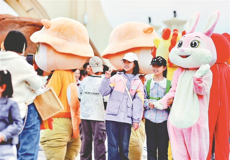 游客紛紛與可愛(ài)的卡通人偶拍照。本報(bào)記者 蘇強(qiáng)攝