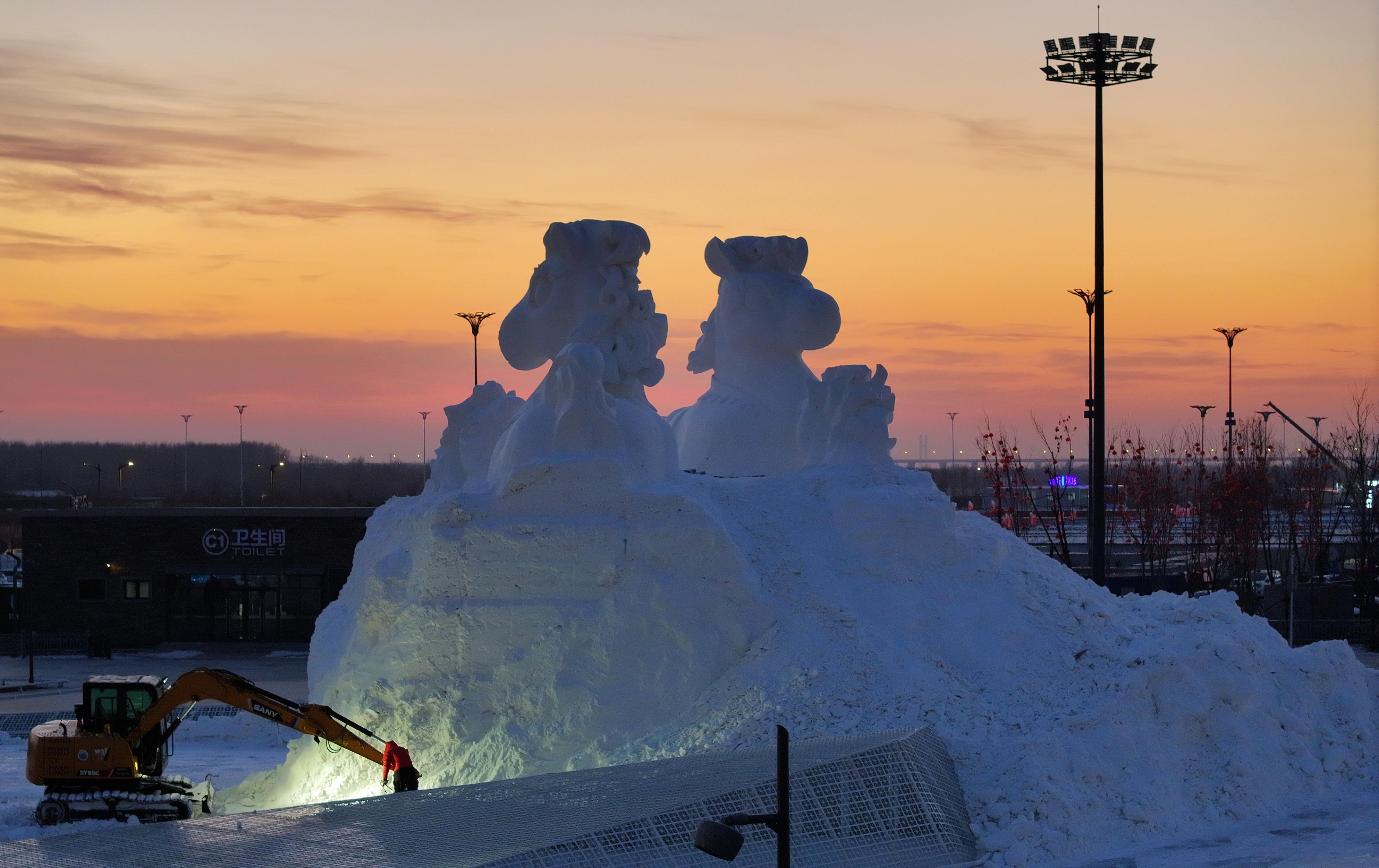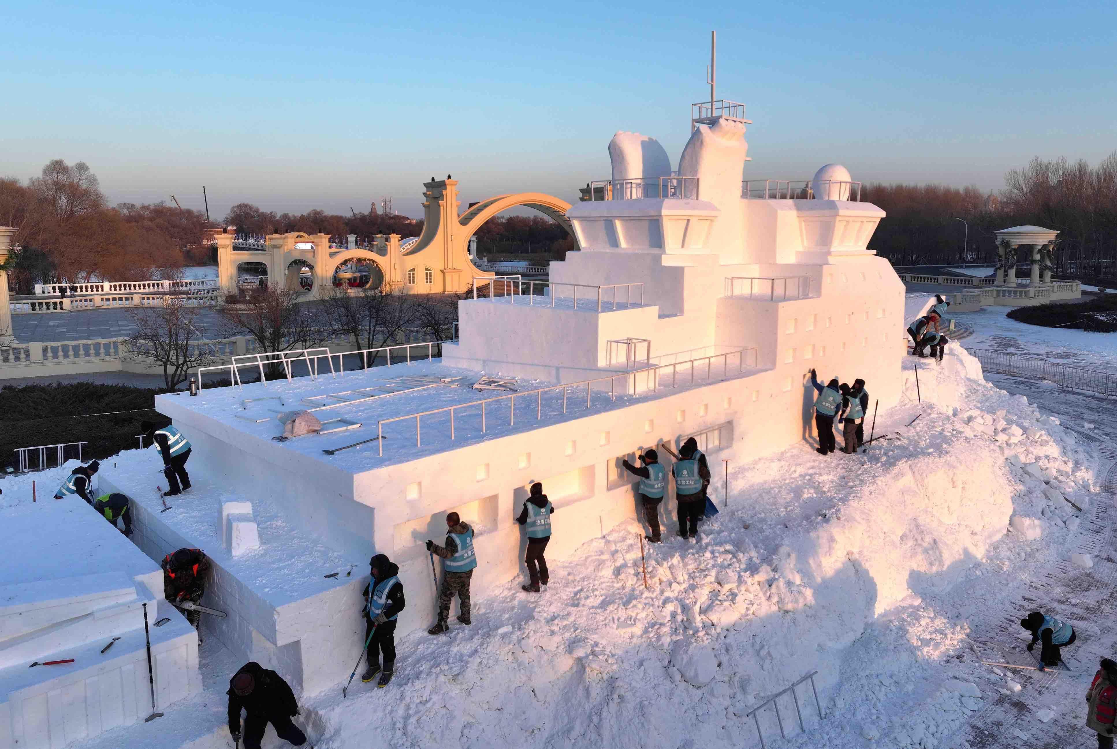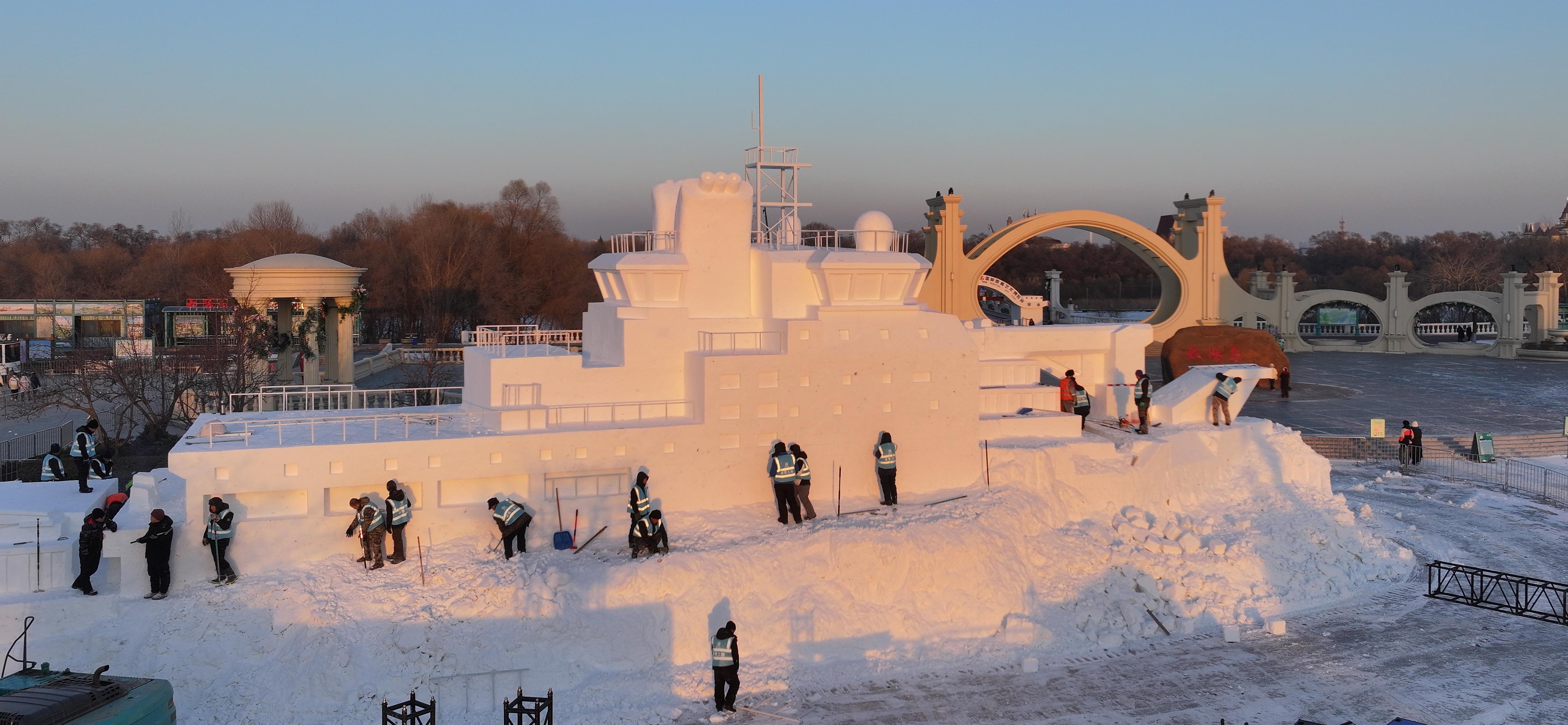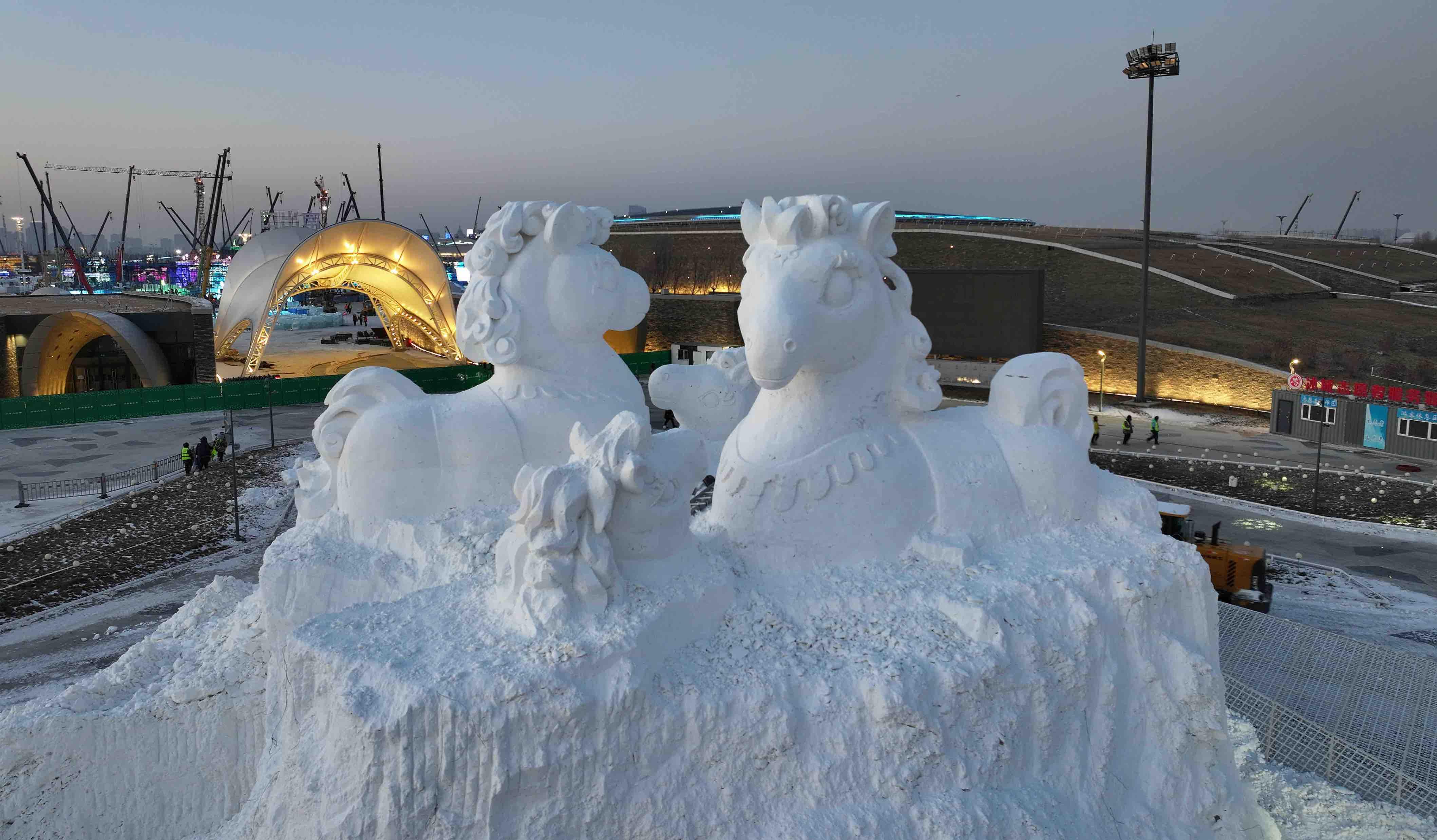 12月6日,第二十七屆哈爾濱冰雪大世界的標(biāo)志性雪塑“童話小馬一家”與第三十八屆太陽島雪博會的“雪龍二號雪雕船”施工進(jìn)度均已過半,即將驚艷亮相。