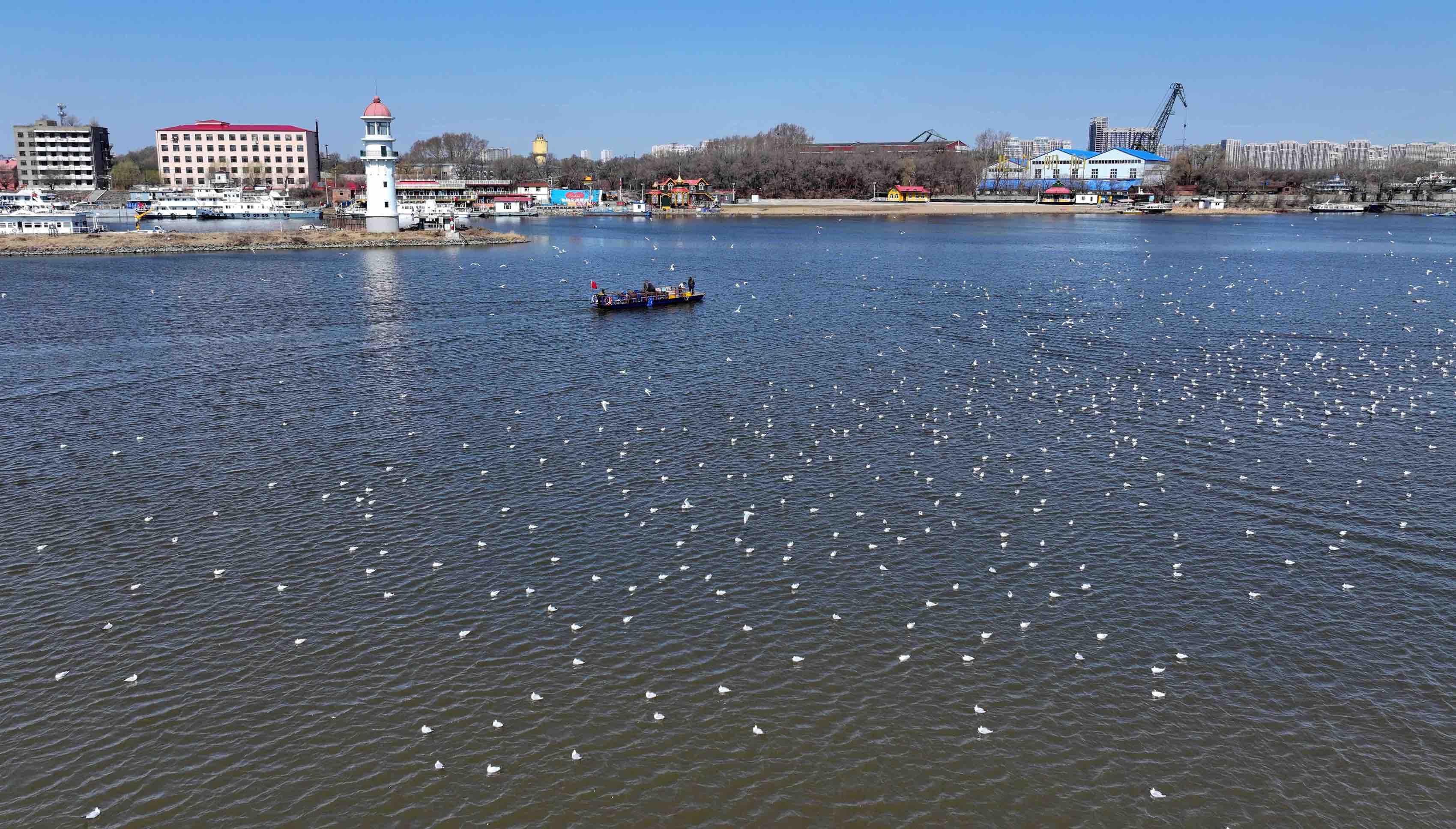 紅嘴鷗如雪花般落滿松花江