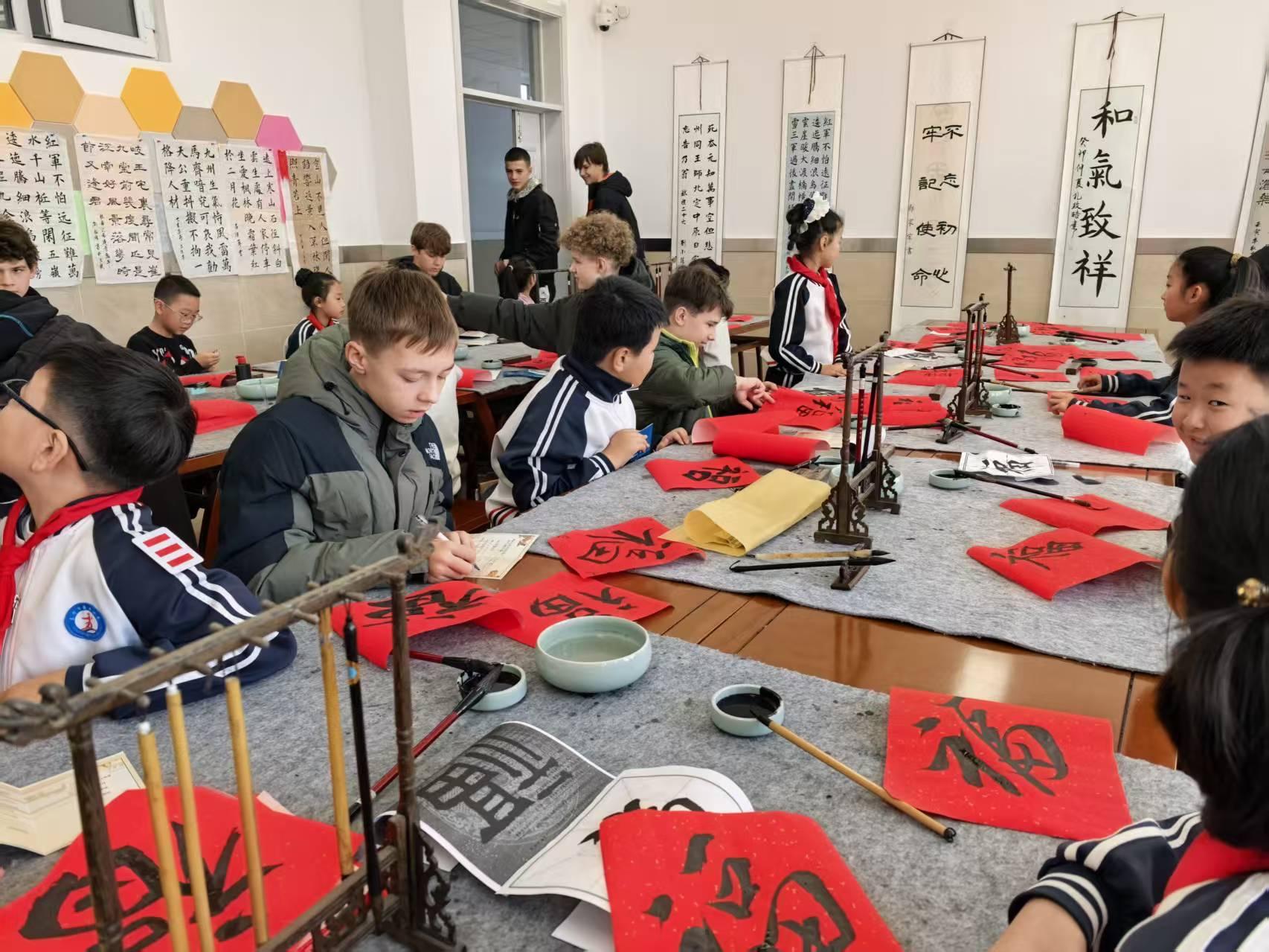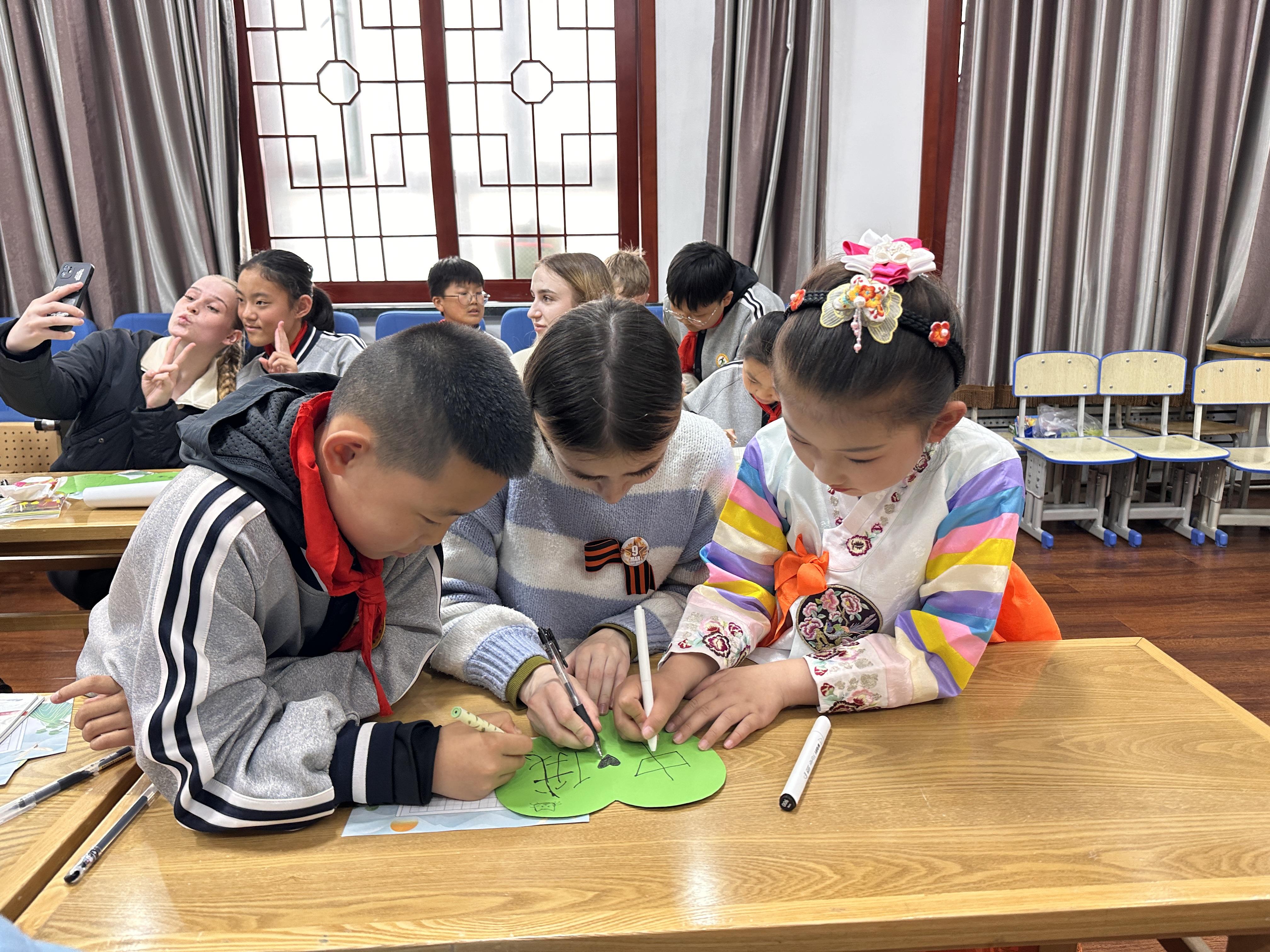 中國小學(xué)生和俄羅斯小朋友共同書寫“中俄友誼”